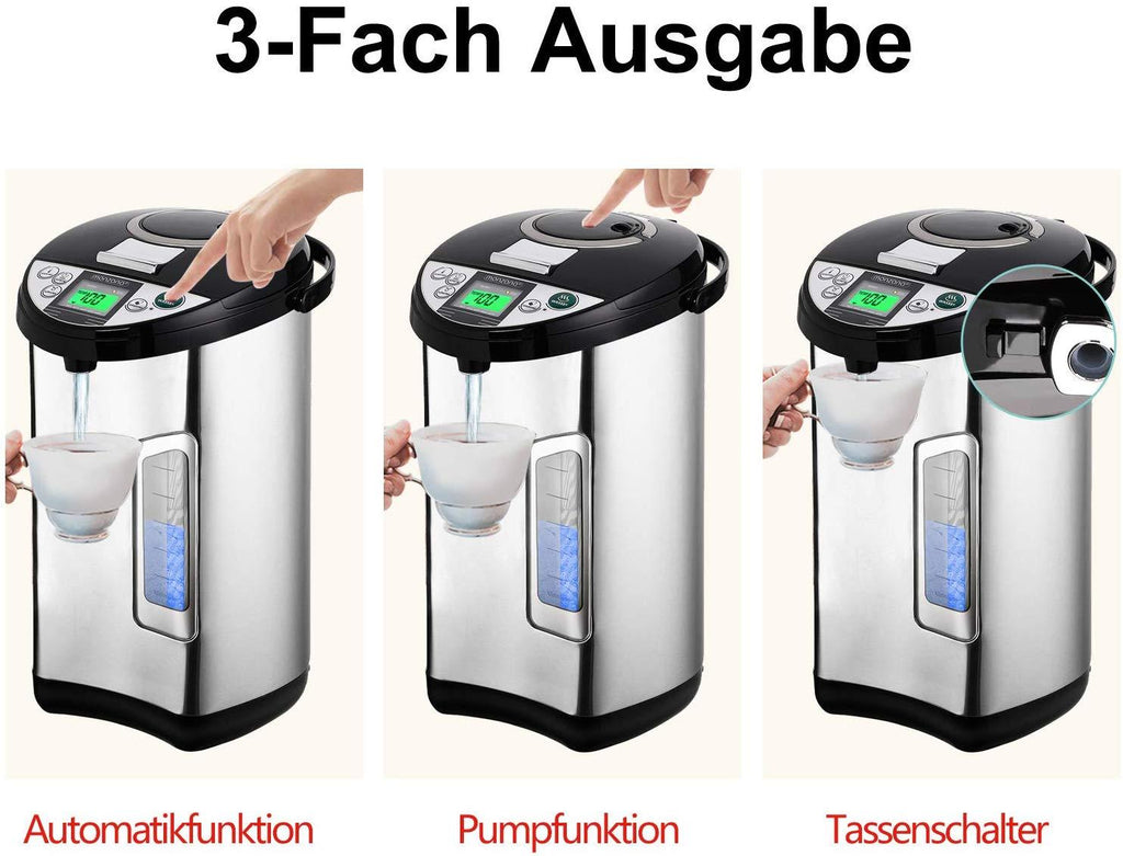 - Große Kapazität: Fassungsvermögen von 5 Litern, gleich 20 Tassen 250ML, ausreichend für die ganze Familie. 3 in 1 Funktion als Wasserkocher, Thermoskanne, oder Wasserspender. Innenraum vollständig aus Edelstahl (Wasser kommt nicht mit Plastik in Berührung)