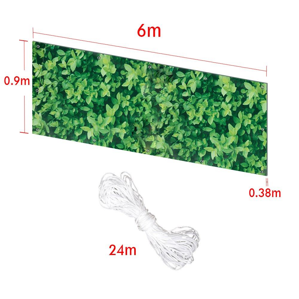 Perfekter Sichtschutz - Unsere Balkonumspannung eignet sich perfekt als Sichtschutz vor neugierigen Blinken. Genießen Sie die Freiheit der Natur ohne auf Ihre Privatsphäre zu verzichten.Einfache Montage - Durch die mitgelieferte reißfeste 24m Kordel und von oben nach unten, von links nach rechts eingenähte Alu-Ösen ist Schrauben und Bohren unnötig. Sie können den Balkonsichtschutz schon nach wenigen Minuten an jedem Geländer befestigen. Länge Kordel: 24 m, Anzahl Ösen: 28.Stablies Material - Hergestellt aus PVC und Polyster, mit einer Grammatur von 450 g/m² ist diese Balkonblende sehr stabil und langlebig. Das Material selbst ist reißfest, witterungsbeständig sowie wasser- und schmutz-abweisend, dadurch sehr pflegeleicht. Bis zu 70°per Hand waschbar.Vielseitige Verwendungen - Diese Balkonverkleidung ist auch ideale Schutz gegen Wind, Regen und UV. Es blockiert bis zu 98% UV-Strahlung. Die beidseitig bedruckte Blende dient sich nicht nur als Blickschutz als auch Dekoration. PERFEKT für Balkon, Gartenzaun, Terrasse usw.Variante - Wir bieten 2 Größe: 0.9 x 6M. Der Balkonbespannung ist horizontal schneidbar(wegen der Schönheit aber nicht empfohlen). Sie erhalten von uns 5x Farben: Buchsbaumoptik.Vorteile: