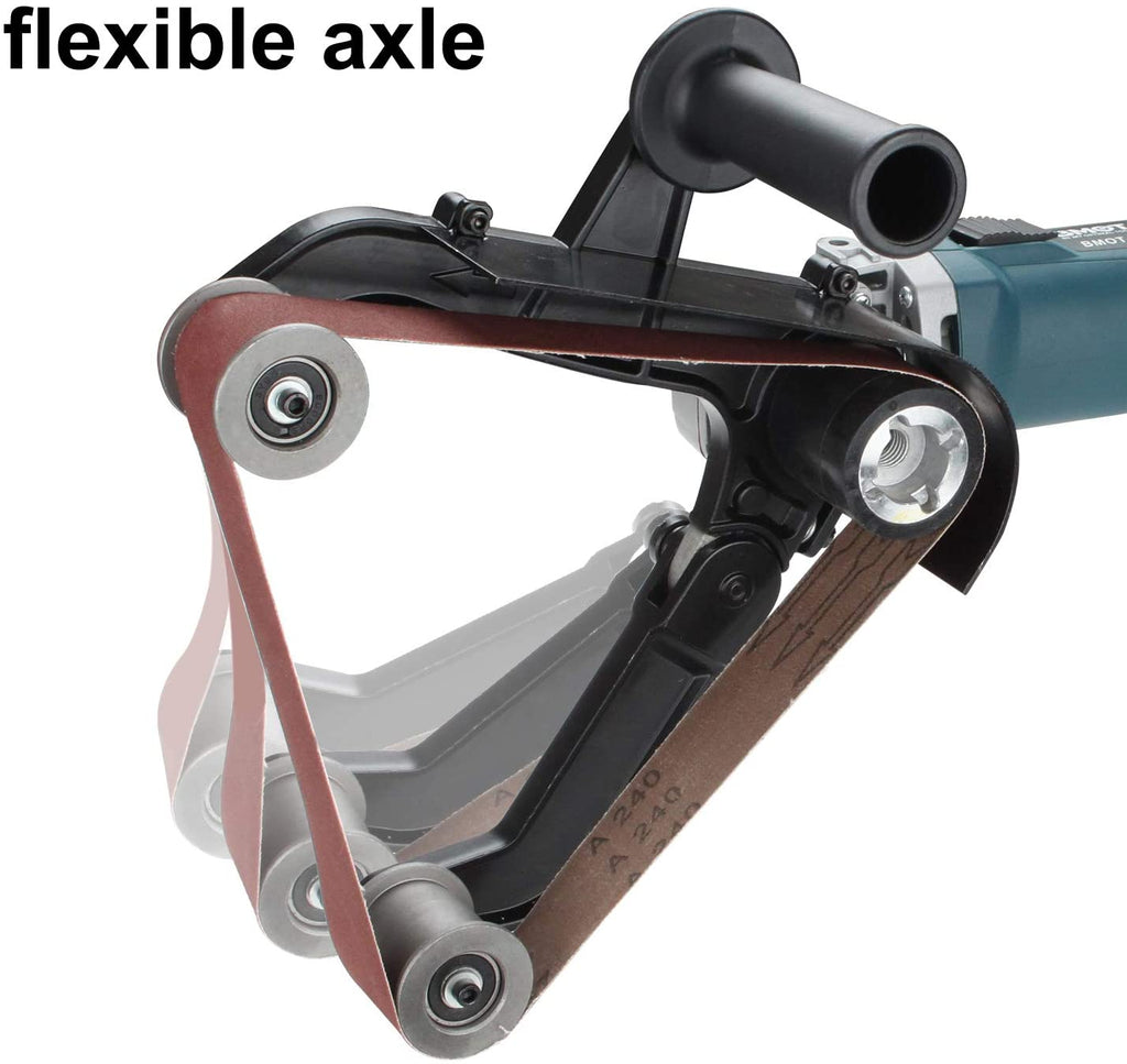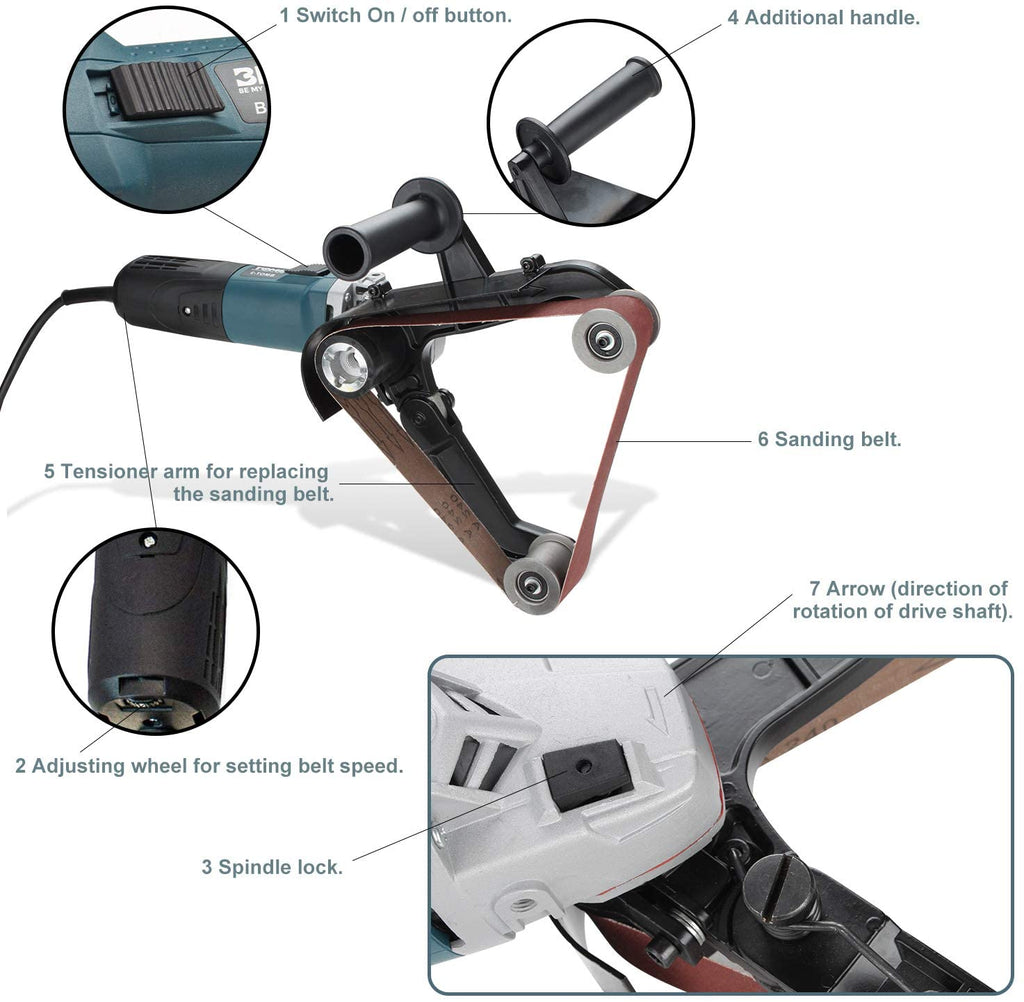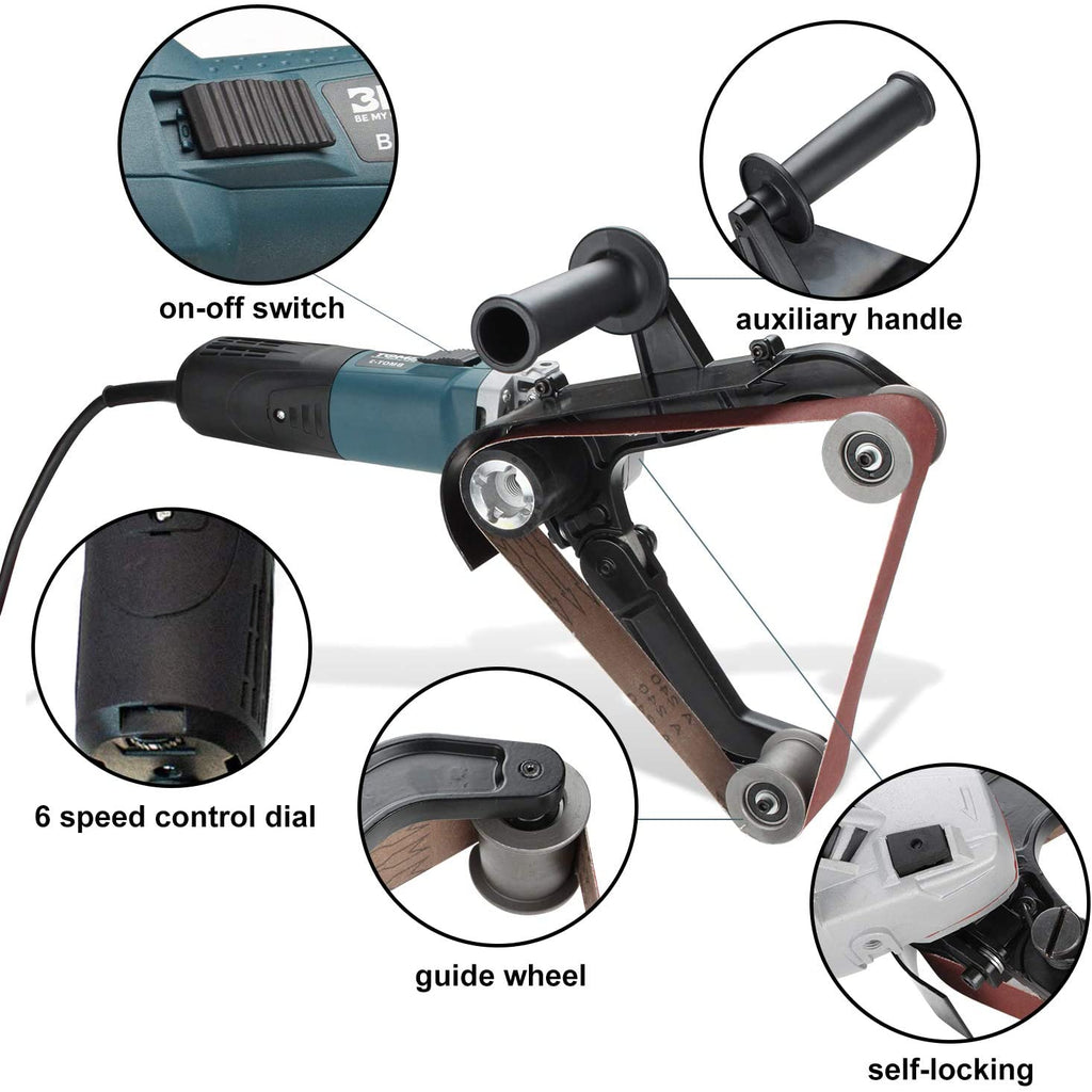 - [Schleifpoliermaschine Merkmale] - Sie können das Antriebsrad entfernen, indem Sie den selbstsperrenden Knopf drücken und das Führungsrad drücken, um den Schleifgurt zu wechseln. Dies ist bequem, schnell und einfach zu installieren und zu entfernen.