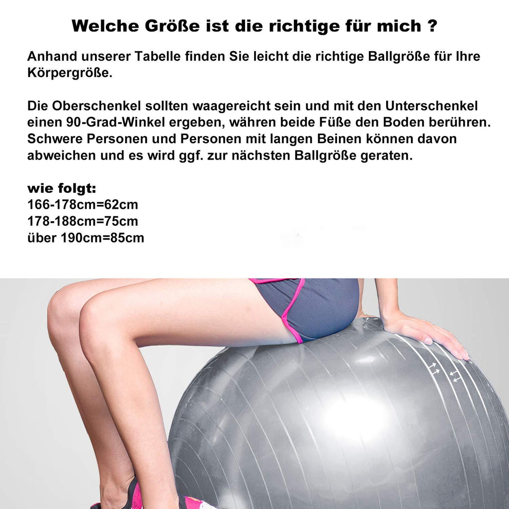 Benutzertipps: Bitte wählen Sie die passende Größe.Sehr wichtig ist, dass die Abmessung des Balles der Körpergröße entspricht.Auf dem Ball sitzend sollten Ihre Ober- und Unterschenkel einen 90°Winkel bilden und Ihre Füße den Boden berühren