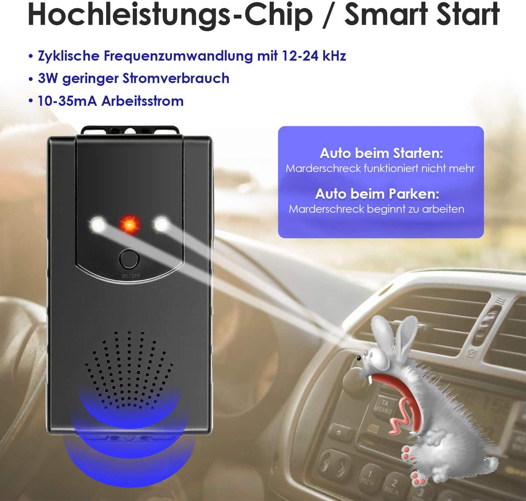 - [Automatische Arbeit] Intelligente Erkennung beim Starten des Autos, wenn das Auto startet - der Maus-Repeller funktioniert nicht mehr, um Energie zu sparen; wenn das Auto ausgeschaltet ist - startet der Maus-Repeller mit geringem Stromverbrauch.