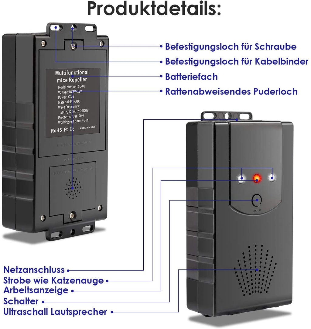Ultraschall + Blitzlicht + Insektenschutz. Die Frequenz wird mithilfe von Ultraschall kontinuierlich geändert, sodass das Gehirn und das Hörsystem der Maus stimuliert und zerstört werden, das Blitzlicht und Kombination von Abwehrpulver(nicht im Lieferumfang) lassen die Maus sich panisch, lustlos fühlen und aus der Wohnung entkommen.