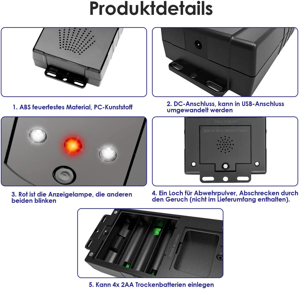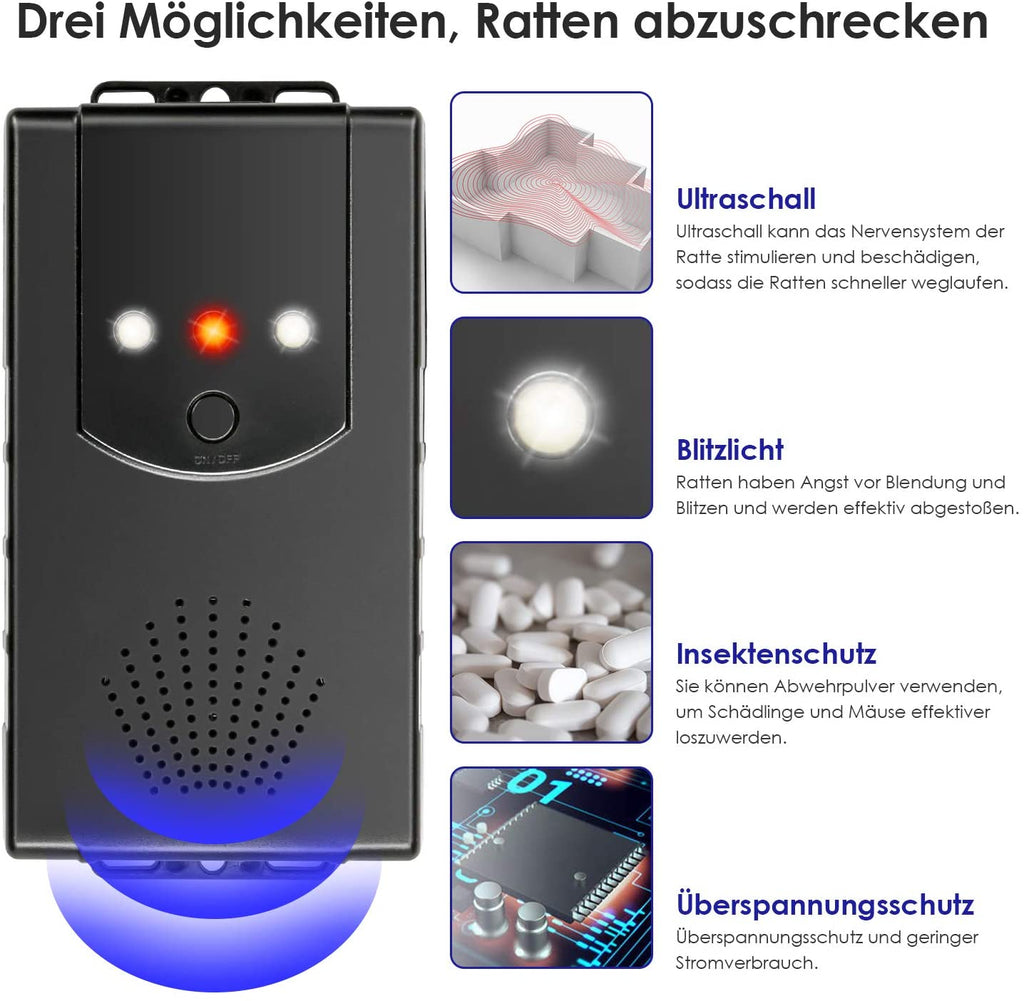 - [Drei Mausabwehrmöglichkeiten] Ultraschall + Blitzlicht + Insektenschutzpillen. Das Produkt verfügt nicht nur über Ultraschallwellen und Blitzlicht, die für den menschlichen Körper harmlos sind, um Mäuse, Nerze und andere Tiere abzuschrecken, sondern kann auch Insektenschutzmittel(nicht im Lieferumang) in das Puderloch hinzugefügt werden, um zu verhindern, dass andere schädliche Tiere wie Kakerlaken, Spinnen, Ameisen und Flöhe sich dem Fahrzeug nähern.
